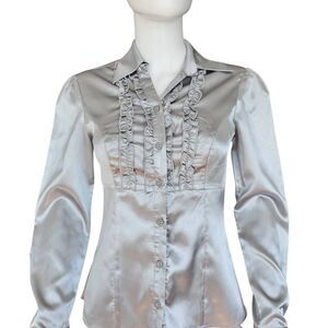 so rare & flattering silver corset-style blouse with ruffle detailing and smoky buttons