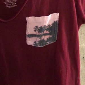 maroon flowy short sleeve t-shirt with pocket on upper left, pocket has palm tree design