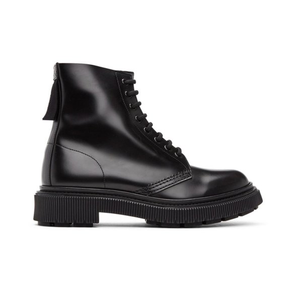 Black waxed leather combat boots, round toe, 8-eyelet lace up front fastening, grosgrain heel detail, stitched panels, chunky injected rubber sole.