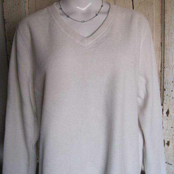 Cream v neck 100% polyester shirt. Warm and fuzzy. Very simple and basic and can be dressed up or casual wear.
