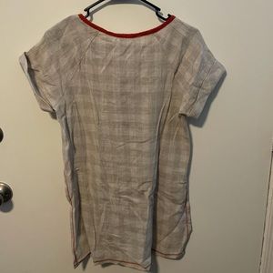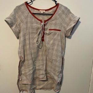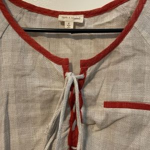 hem & thread beige tunic shirt size small with orange trim and cross cross bow front. gentle used condition. made of hemp biodegradable
