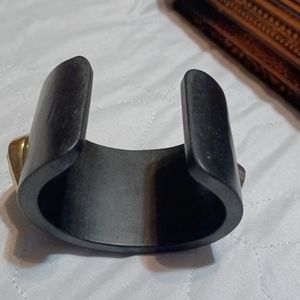wooden bracelet with gold details and turquoise stones