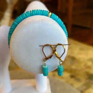 turquoise bracelet & earrings set, original, gold accents, stretchy, hand made