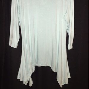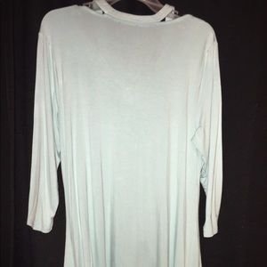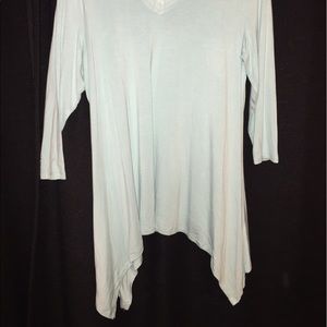 It's turquoise with small cutouts on top. It's very soft and comfortable. It's never been worn still has tags. Longer on the sides. Has a vneck. Very flattering. Size large.