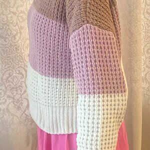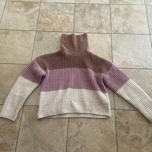 This is a knit turtleneck sweater. It is made in a thick, soft, and warm material. It has a long neck which is really good in the winter. It has three stripes brown, pink, and white. It is a size small and only was worn a couple times.