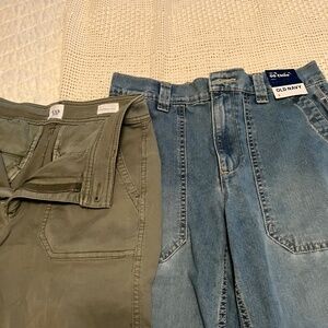 Two pair bundle of cropped casual pants. One denim new with tags by Old Navy with a gathered waist in back. size small. One khaki used size 4. In good shape.