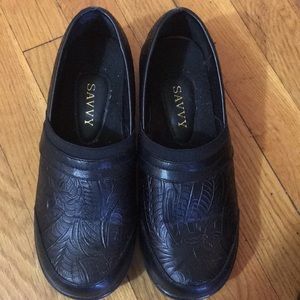 One blue pair of Dansko clogs amd one pair of black savvy brand clogs! Black Savvy brand, has a floral pront engraving. Very pretty! Size 37 UK!
