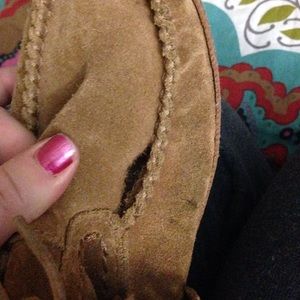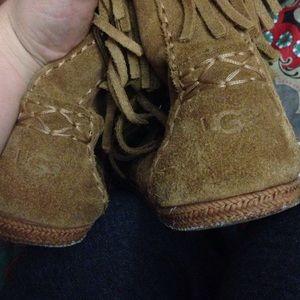 ugg booties with fringe on them, they're in ok condition .. they have a small tear on the (pic4) and they do have some stains on both shoes (pic3) . they're a size 3 in kids but can fit a size 5/5.5.