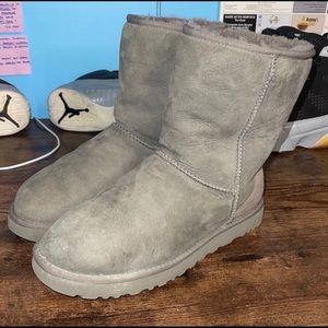 2 pair of ugg boots (classic short II) sz 8.5 M 10 W in chestnut and grey colorway. both have treadlite and water resistant technology, chestnut pair have small stain on upper area but are in basically new condition and have only been worn once. grey pair used and wear can be seen in pictures listed. price negotiable, comes w box and cleaner