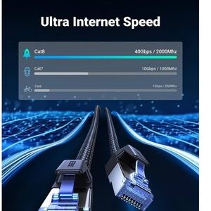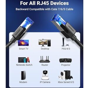 Wide Compatibility: With the RJ45 Connector, UGREEN Gigabit Cat 8 ethernet cable can be perfectly compatible with computers, laptops, modems, routers, PS5, PS4, PS3, X-Box 360, X-Box One, Switch, networking switches, ADSL, network adapters, hubs, and other networking devices. It can also be fully backward compatible with Cat7, Cat6e, Cat6, Cat5e, Cat5