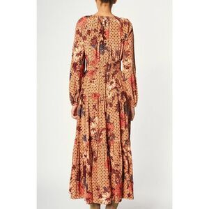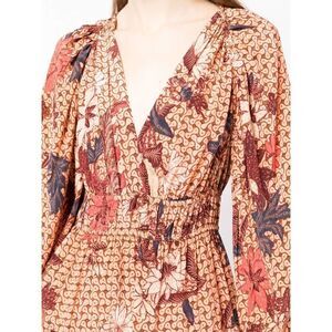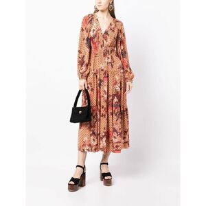Linnea floral-print midi dress from ULLA JOHNSON featuring peach pink, red, silk, crepe de chine, all-over floral print, geometric-pattern print, V-neck, high-waisted, tiered skirt, long sleeves, straight hem and mid-calf length.