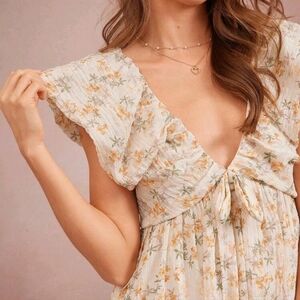 ummer Ditsy Floral Printed Textured Woven Deep V Neck Bow Front Short Ruffle