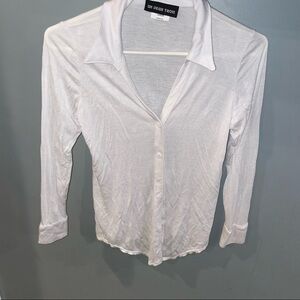 Lightweight White Long-Sleeve Button-Down Shirt with White Front Buttons. This versatile white long-sleeve shirt features a classic collar and a full button-down front with matching white buttons. It has a relaxed fit and can be worn open as a layering piece or buttoned up for a more polished look. Perfect for a comfortable and chic everyday staple!