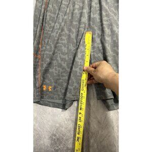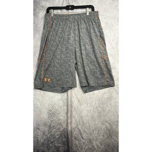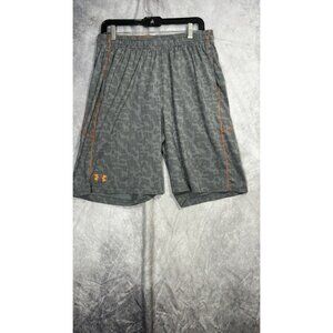 The product is a pair of men's athletic shorts from Under Armour in size Large. They feature an elastic waistband and tie closure for a secure fit during activities such as gym and training, basketball, and running and jogging. The shorts are lightweight and come in a gray color with orange accents.