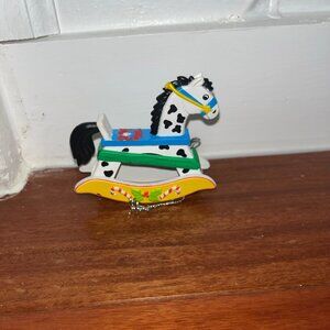 This product is a small unicorn ornament perfect for Christmas decorations. The ornament features a unicorn shape and comes with a hanging feature to easily display it in your home. It is an original piece and not a vintage or antique item, ideal for fans of unicorns looking to add a fun and whimsical touch to their holiday decor. This ornament is a single unit and not part of a personalized or themed collection. Original box is included