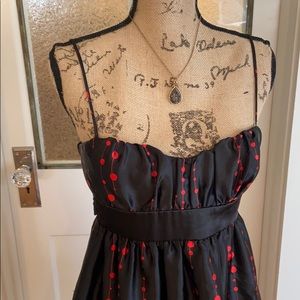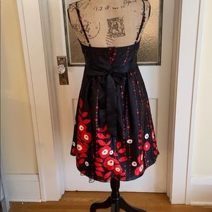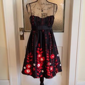 This is a fun empire waisted dress! It has great details ruched bust with liner in it. Bow tie in back and a bit of a liner with some tulle at bottom liner of skirt. Fun flower pattern! Basically a fun Unique beautiful dress💕