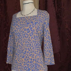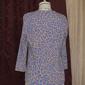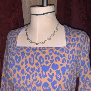 Blew an off on’s. Leopard print throughout. Square pleated neckline. Three-quarter sleeves. By Jones New York signature. Large. Cotton blend.. Really cool but not my size. Someone needs to support this but not me.