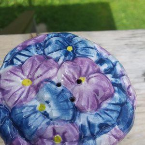 unique ceramic salt and pepper shakers ,frog under flowers. Soda can in pic to help with size visualization ~ 3" tall x 4" long
