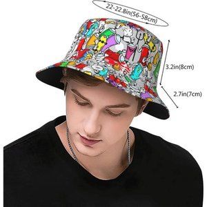 -3D Graffiti Cartoon Prints Hip Hop Cool Reversible Bucket Hats Protects Your Dome , Keeps Sun Off Your Face ,Brim is perfect for Shade , Does not block too much view ,Perfect for Spring Summer Autumn , Travel, running, biking, hiking, fishing,hunting,camping ,trips,weekend getaway,photography sports,hip-hop ,beach vacation and outdoor activities .