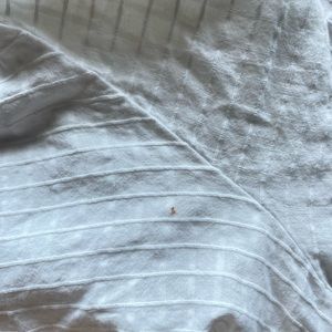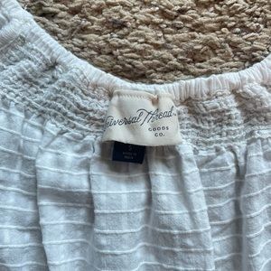 White Universal Thread top. Small stain, but otherwise is great condition. Stain is not noticeable when wearing the item (by the arm seam). Ties in the front.