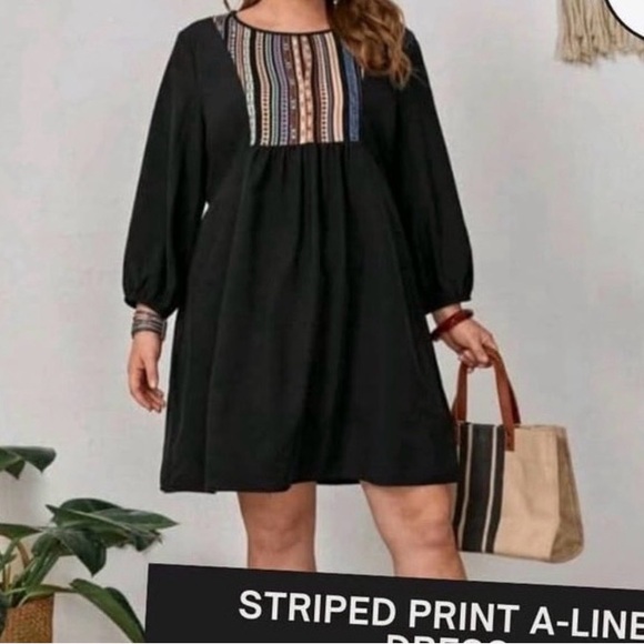 Elevate your style with this chic black A-line dress featuring a striking striped print. Perfect for any occasion, this dress combines comfort and elegance effortlessly.