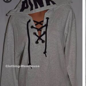 1x Victoria’s Secret pink slouchy campus lace up pullover hooded sweatshirt/jacket/hoodie (relaxed fit , size M-medium) GUC no rips stains etc (see pics to verify items condition)