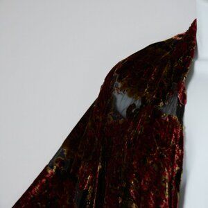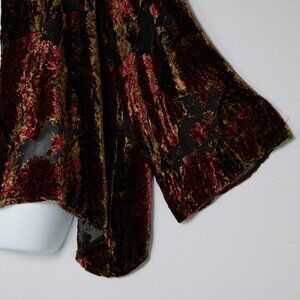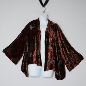 velvet burnout jacket, dark multicolored, open style, draped, 3/4 bell sleeve, lightweight, made by Rebekah