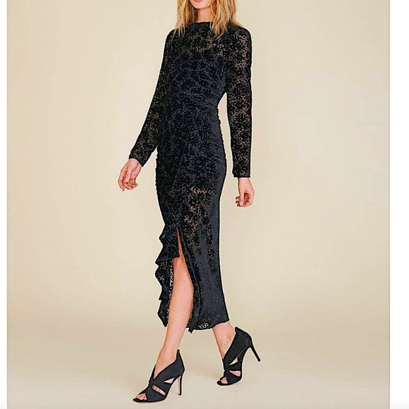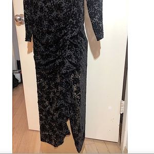 A medley of animal patterns are done in plush velvet across this delicate devoré dress detailed with ruching along the side that leads to a leg-flaunting slit.
