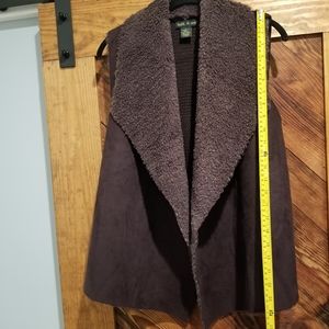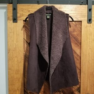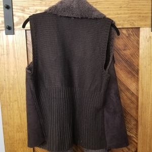 faux suede front with sweater back and faux sherpa collar and front drape inset, deep rich chocolate brown color size large