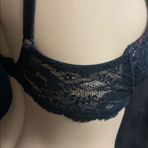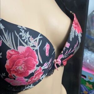 Victoria’s Secret 32D Dream Angels push up bra. Floral print front, black cups, lacy see through sides. Double hook back closure Excellent condition