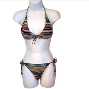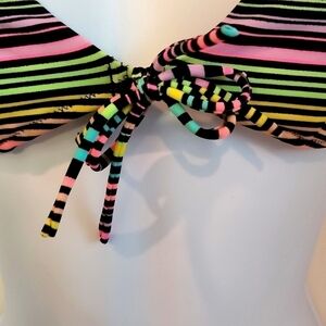 Cute neon colored striped bikini with black lining. No padding in top but has a pocket to add it if desired. Tie neck, back and sides on bottoms. Cute tie detail on top front. Ruched bottom for rear enhancement.