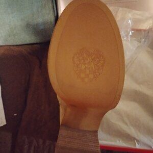 Stone colored suede. Never worn. New in box. Lace up front. Side zip closure. Stack heel and round toe.
