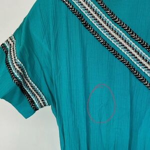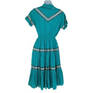 vintage 1950s rockabilly, western, square dance dress, shade of teal blue, elastic waistband, short sleeve, collar, rickrack trim