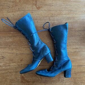 Incredible and rare vintage leather boots circa 1960. Soft blue leather. Rounded square toe and block heel. Leather laces are replacements and not original.
