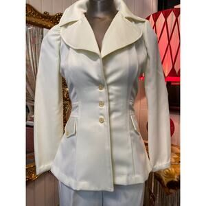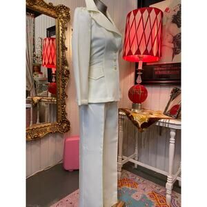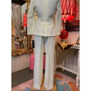vintage 1970s cream pantsuit 70s jacket and pants flared butterfly mod polyester