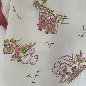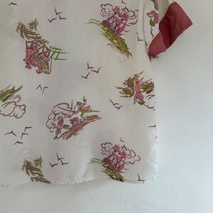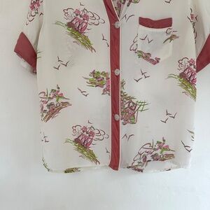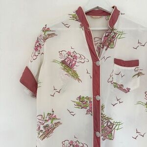 Vintage top from the 1950s with a cute pirate / ship themed print. Flattering boxy fit. Cute worn buttoned up or open as a layer over a tee or tank.