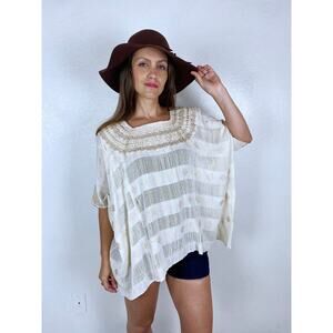 Stunning summer top! Cream woven cut out Mexican top features heavy beige embroidered trim. Semi sheer material with subtle stripes. Super free fitting breezy cape shape with wide sleeves. Embroidery on the edges, too. Material is semi sheer. Really gorgeous handmade piece. Will fit a range of sizes.