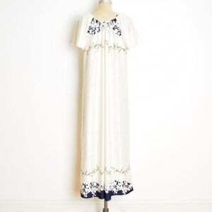vintage 70s maxi dress cream navy floral border print caftan tent hippie boho M