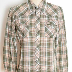 vintage 70s top shirt thin plaid olive green western cowgirl blouse S M