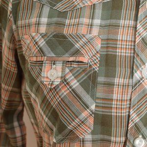 This is a super cool vintage western shirt from the 70s. It's made of light-weight, thin woven fabric (feels like a cotton/poly blend) that's olive green, orange, and white plaid. This shirt has two little pockets and it closes up the front with a row of buttons.