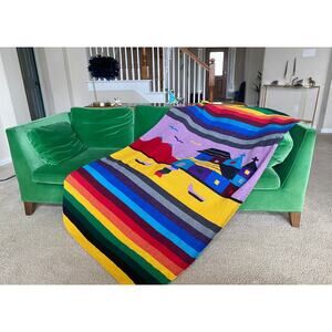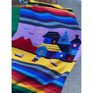 Awesome vintage Mexican blanket! This terrific one of a kind blanket features the silhouette of a little Mexican villa with an Iglesia and the hills in the distance. Kaleidoscopic rainbow stripes. Subtle thin metallic threads woven throughout -- so cool! Medium weight cotton material. Perfect for yoga, camping, picnics, etc.