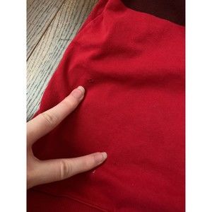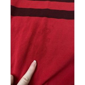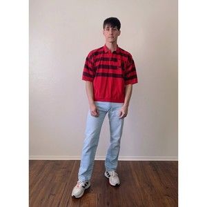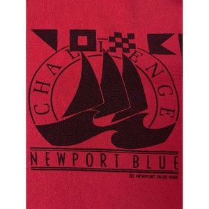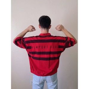 Vintage red polo shirt from Newport Blue marked 1988 on the front. Has black stripes on the top half front and back. Collared neckline with buttons. Fitted band around waistline. Boxy style fit. "Newport Blue" printed across the back.