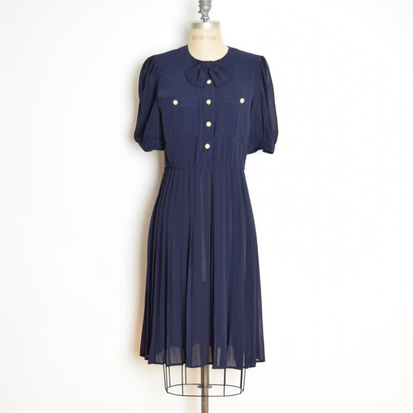 vintage 80s dress navy blue pleated bow military secretary midi tea dress M