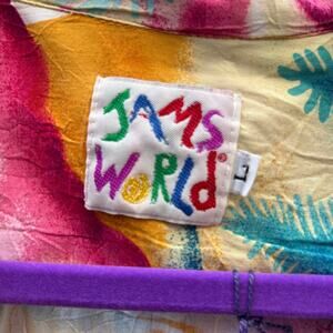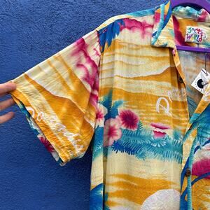 bright, fun, and perfect for summer / tropical print with the words paradise island throughout / excellent vintage condition