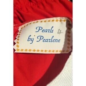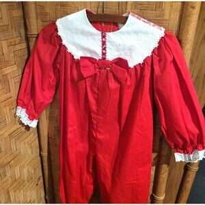 Adorable vintage romper handmade by Pearlene for Pearls for Pearlene. The romper closes zips up the back, has elastic puff sleeve cuffs. Appears to not have been worn. The bow is attached with a removable pin so you can leave on or remove if you wish. The lace overlay collar has a sweet tiny pearl sewn on as a trademark of the seamstress. There is a bottom Christmas bell sewn onto the leg cuff. So cute and adorable! Listed as a size 4, cut go by measurements to ensure fit. Meant to be a roomy fit.