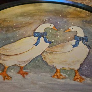 vintage 80s metal round tray 2 geese ducks w/blue bows