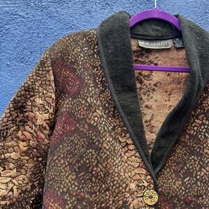 bold and unique / one wood star button closure / great for lagenlook styles / textured, lighter weight tapestry fabric with almost a metallic hue / soft velvety cord collar / structured design and oversized fit / excellent preowned condition