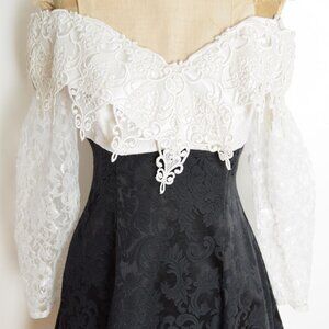 vintage 80s party dress black brocade white crochet lace off shoulder prom XS S