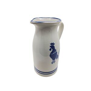 This vintage 1982 stoneware milk pitcher features a charming rooster design. Ideal for rustic or country-themed kitchens, it's a perfect collectible in excellent used condition. Add a touch of primitive charm to your decor with this unique piece.
