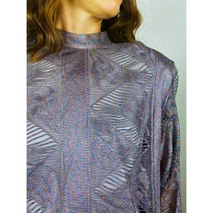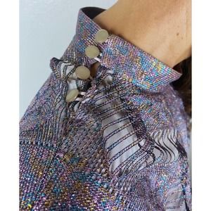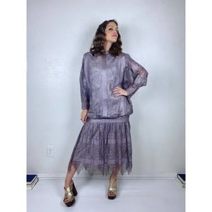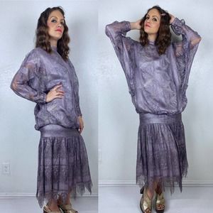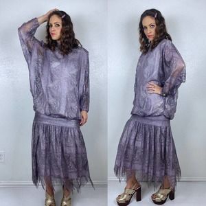 Lavender haze! Fabulous 80s party dress is light purple with metallic sparkle throughout - and the sparkles are rainbow colors! Cut out zig zag lace and batwing sleeves. Flapper style drop waist with a banded hip. Cool fringe zig zag edges and midi length. Fringe is 1.5 inches long. Dress has buttons at the shoulder and the body of the dress is lined. Dress has large shoulder pads that could easily be removed. Truly one of a kind party dress - estimated size medium/large.